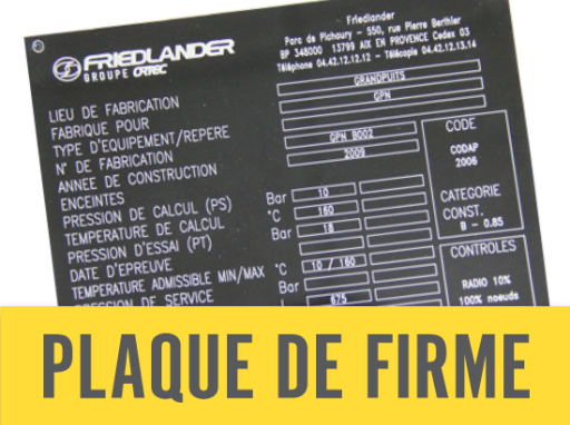 Nous fabriquons tous types de plaque de firme, sur mesure, selon votre cahier des charges.